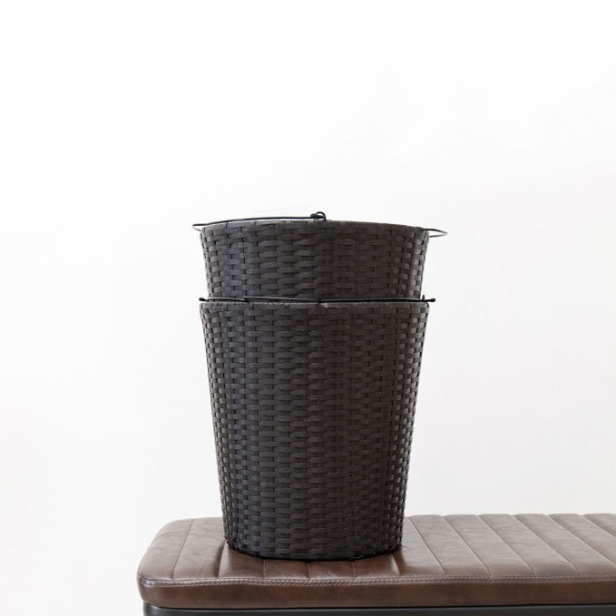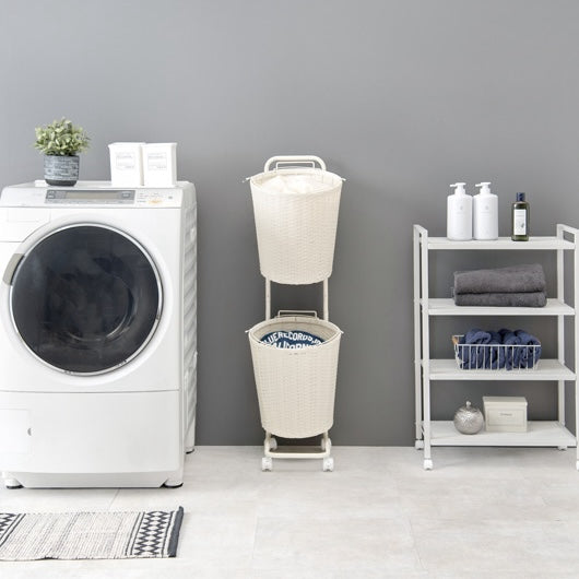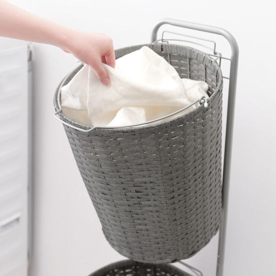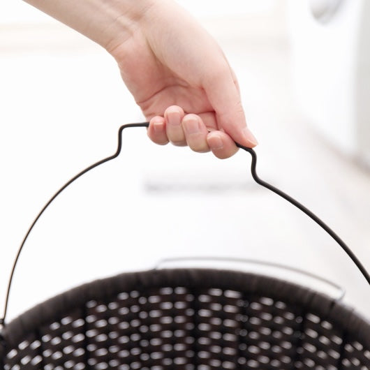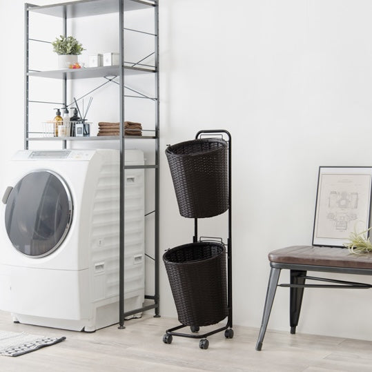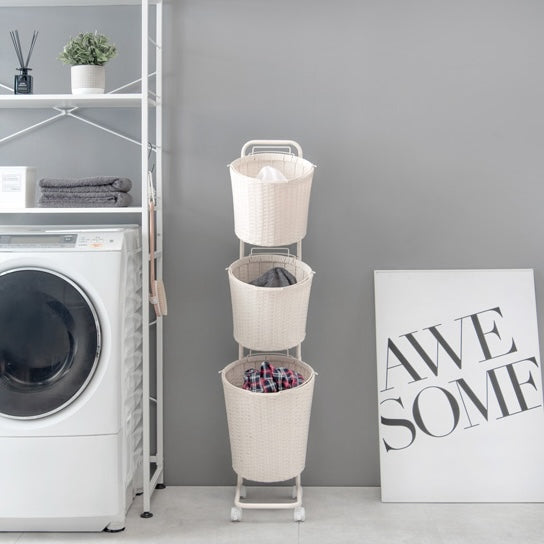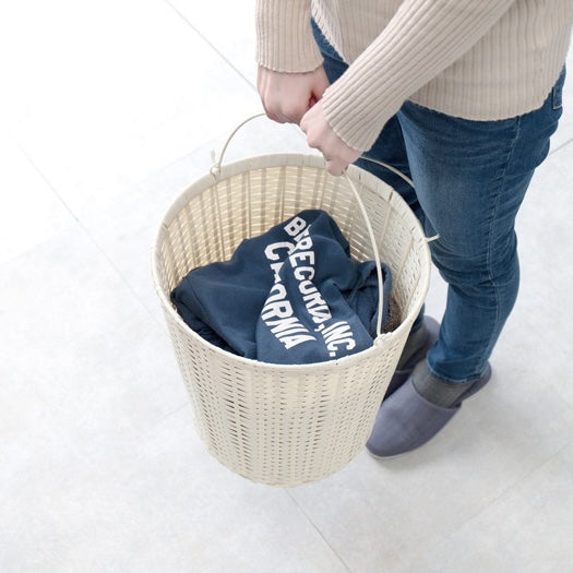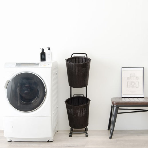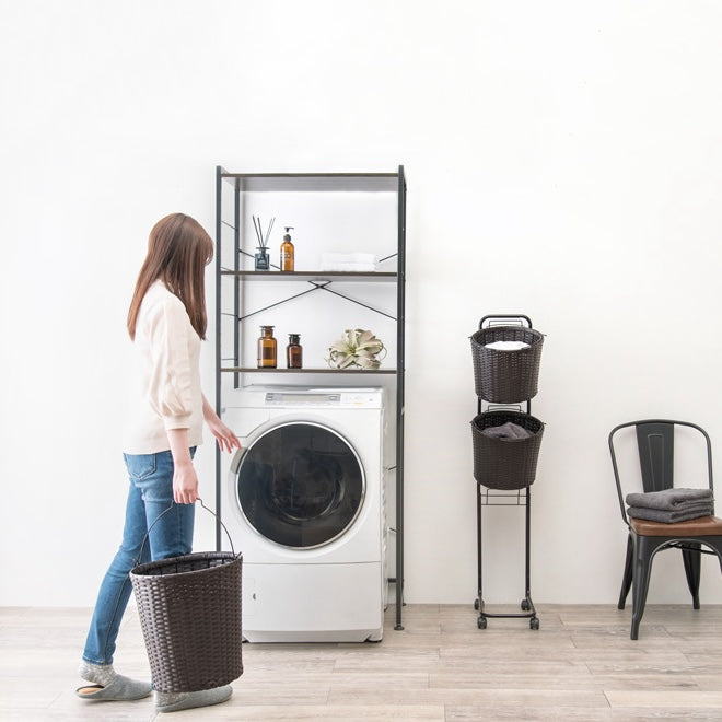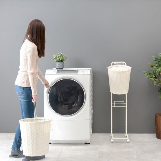 ラタン調ランドリーバスケットラックは、見た目はナチュラルなラタン風、でも素材はポリエチレン。水を弾きやすいので、濡れた洗濯物も気兼ねなく入れられます。