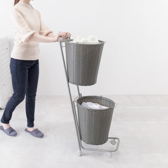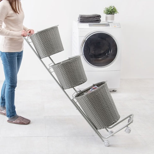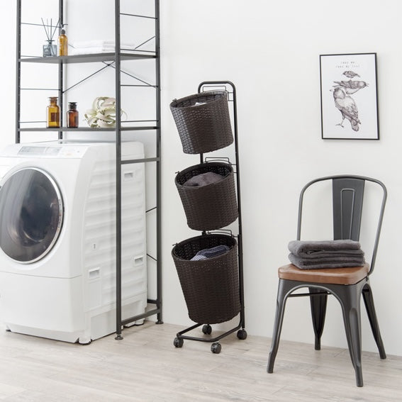バスケットには取っ手が付いていて、取り外してそのまま持ち運びも可能。洗濯機から干し場まで、カゴごとさっと移動できます。さらにキャスター付きなので、ラックごと動かすのもスムーズ。毎日の洗濯動線がぐっとラクになります。