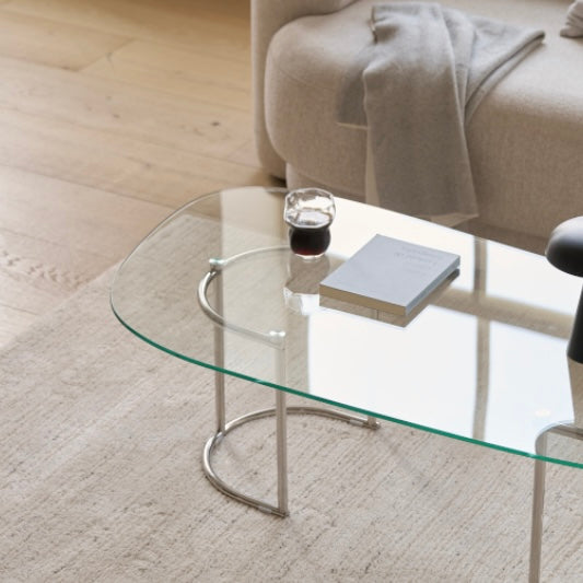 やわらかな曲線を描く楕円形のガラス天板が印象的なローテーブルです。直線的すぎないシルエットで、空間に置いたときの雰囲気がやさしくまとまります。ガラス天板なので視線が抜けやすく、リビングやワンルームでも重たく見えにくいのが特徴です。