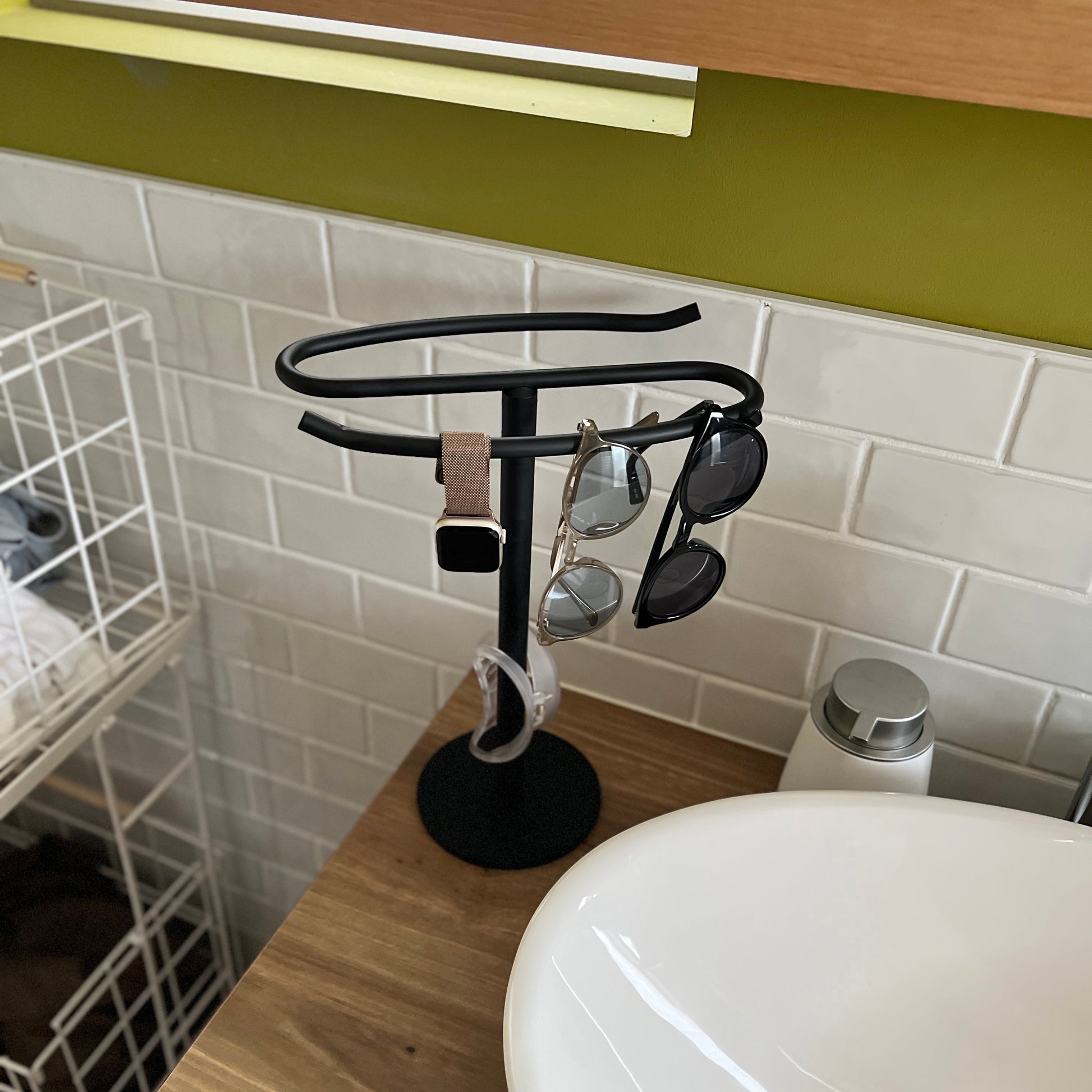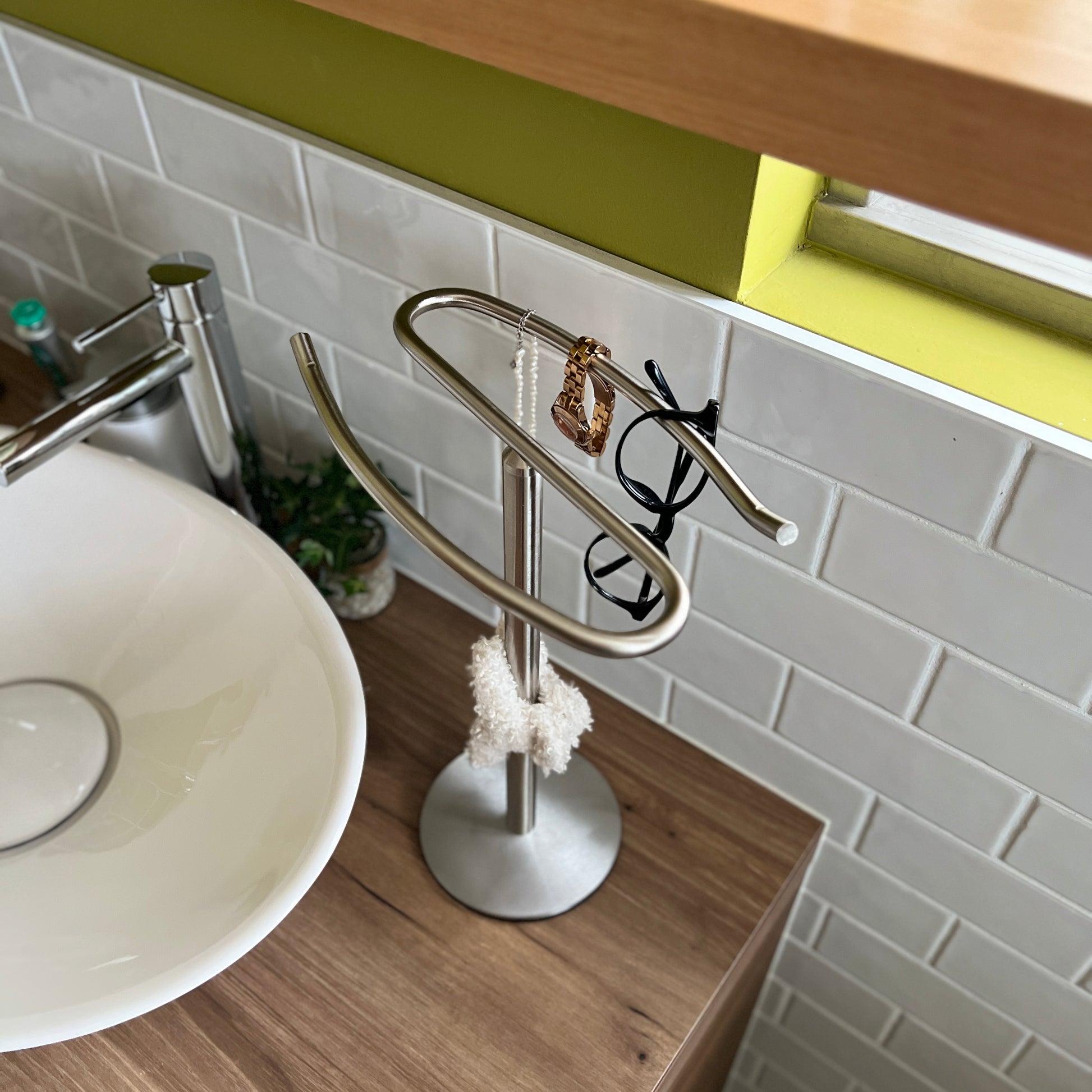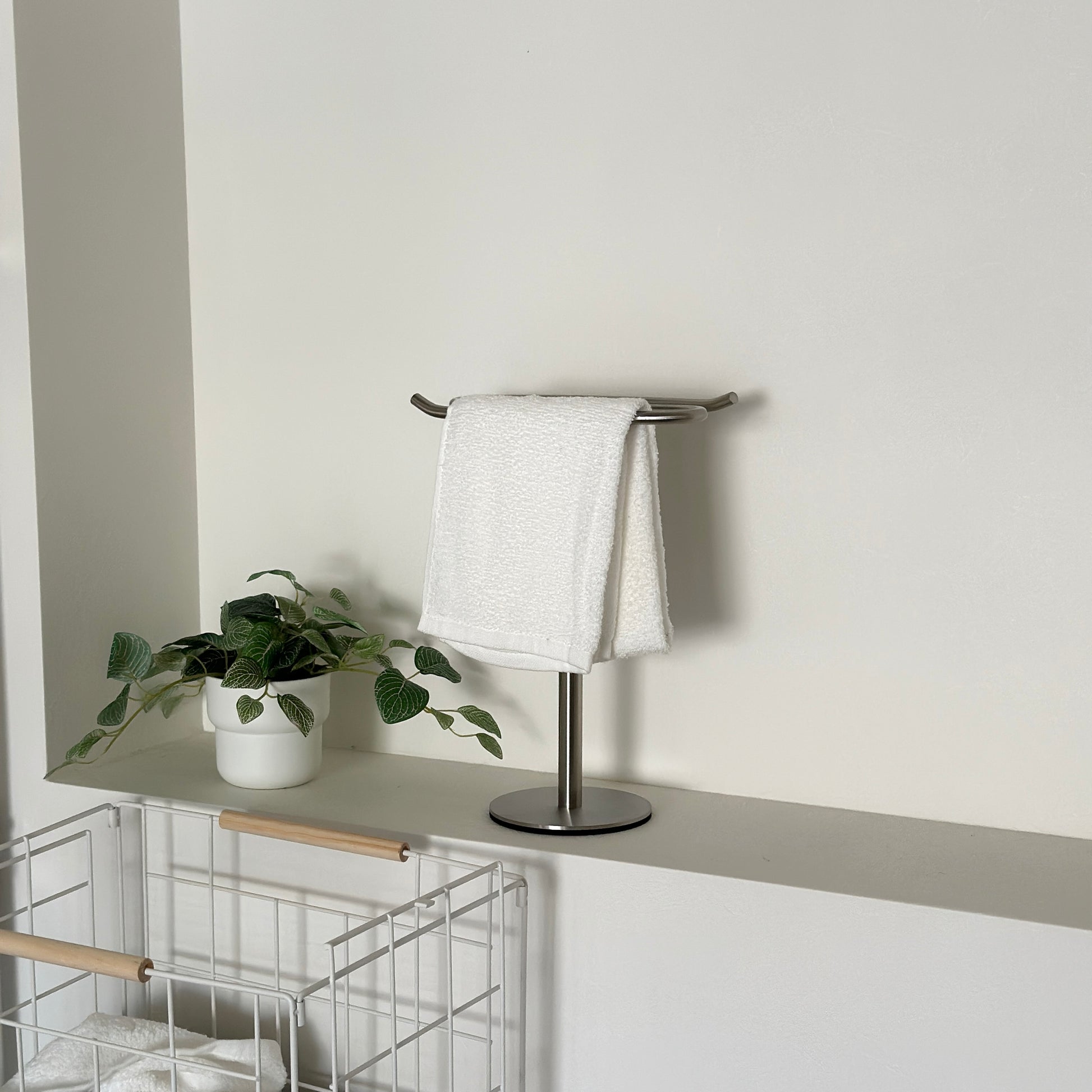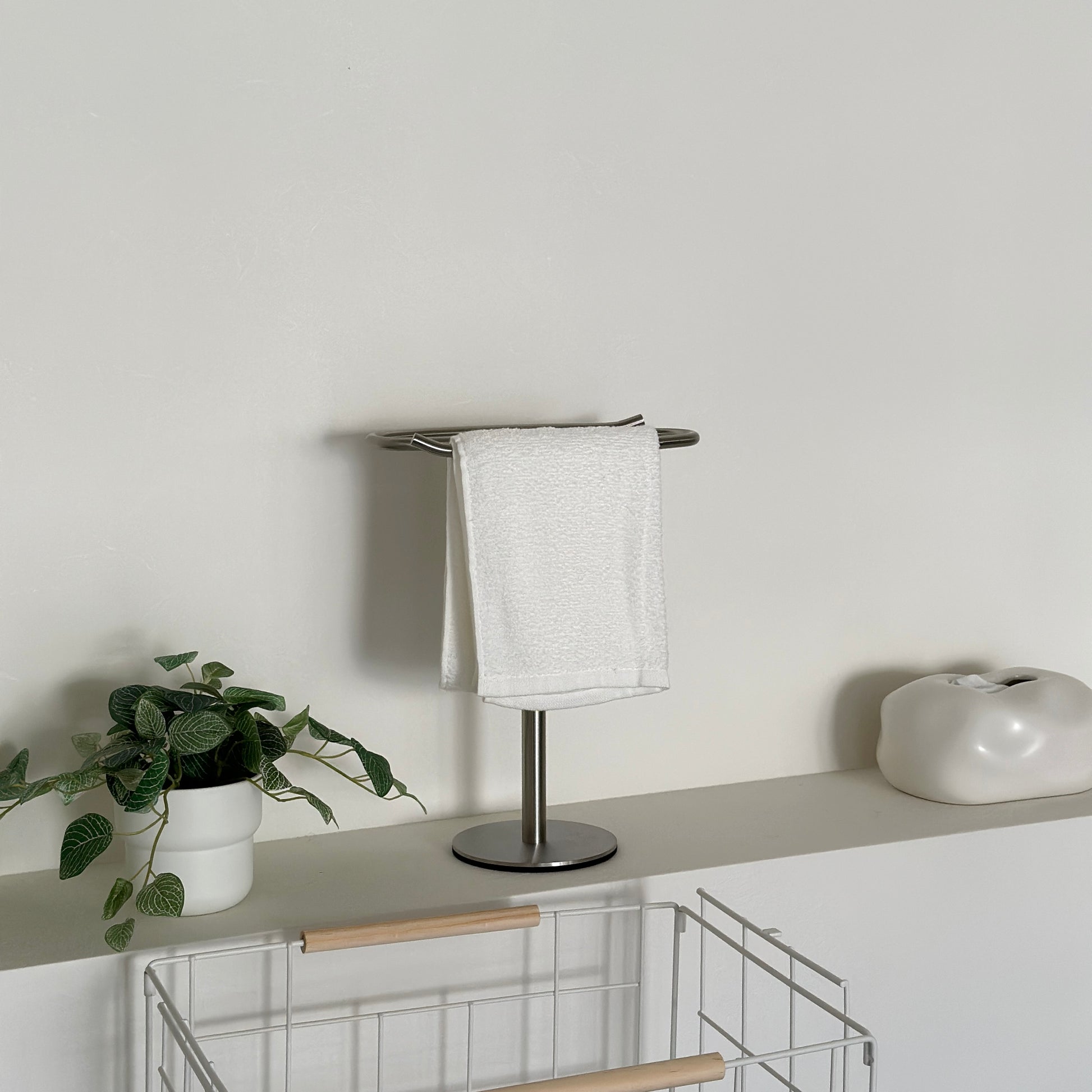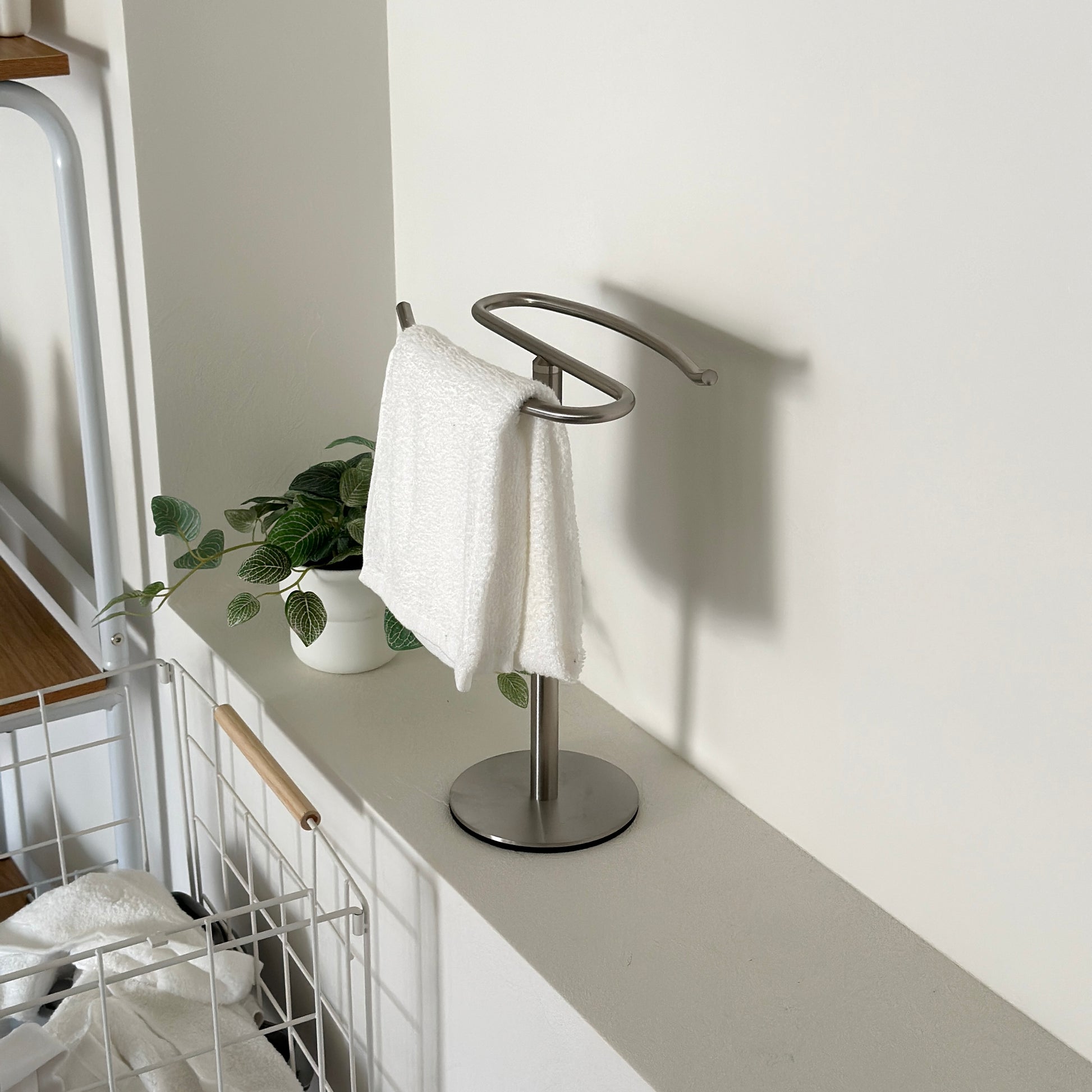 自立型のデザインなので、置き場所を選ばず設置が可能。洗面所ではタオル掛けに、キッチンでは布巾や調理器具の収納に、リビングではアクセサリーや腕時計の一時置きにも便利です。