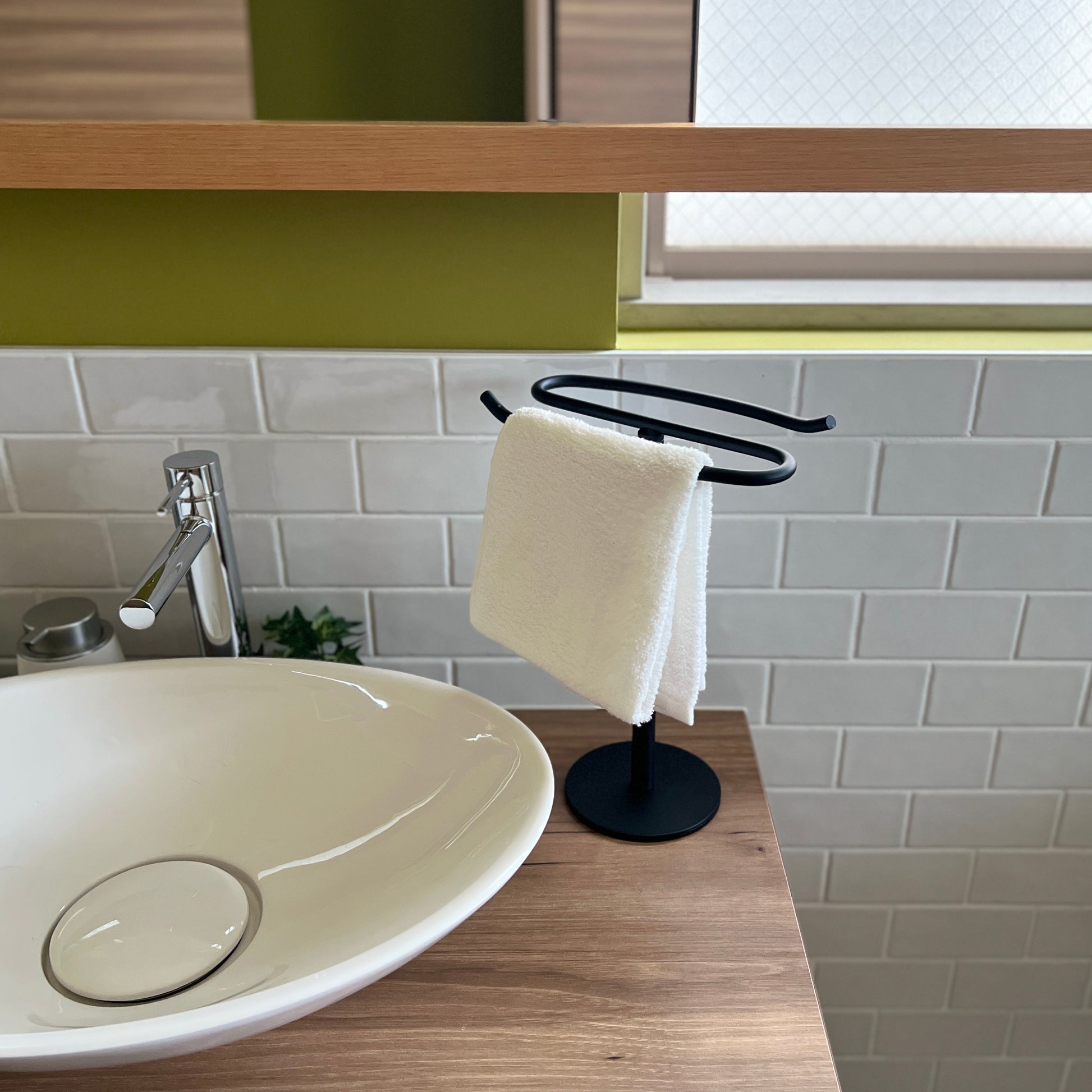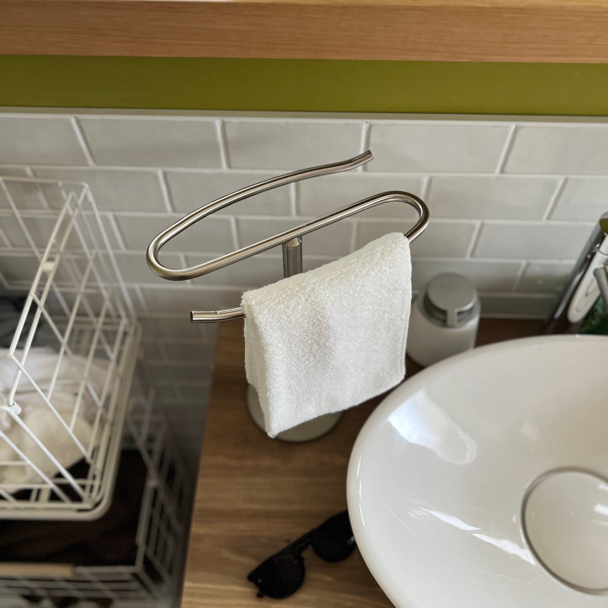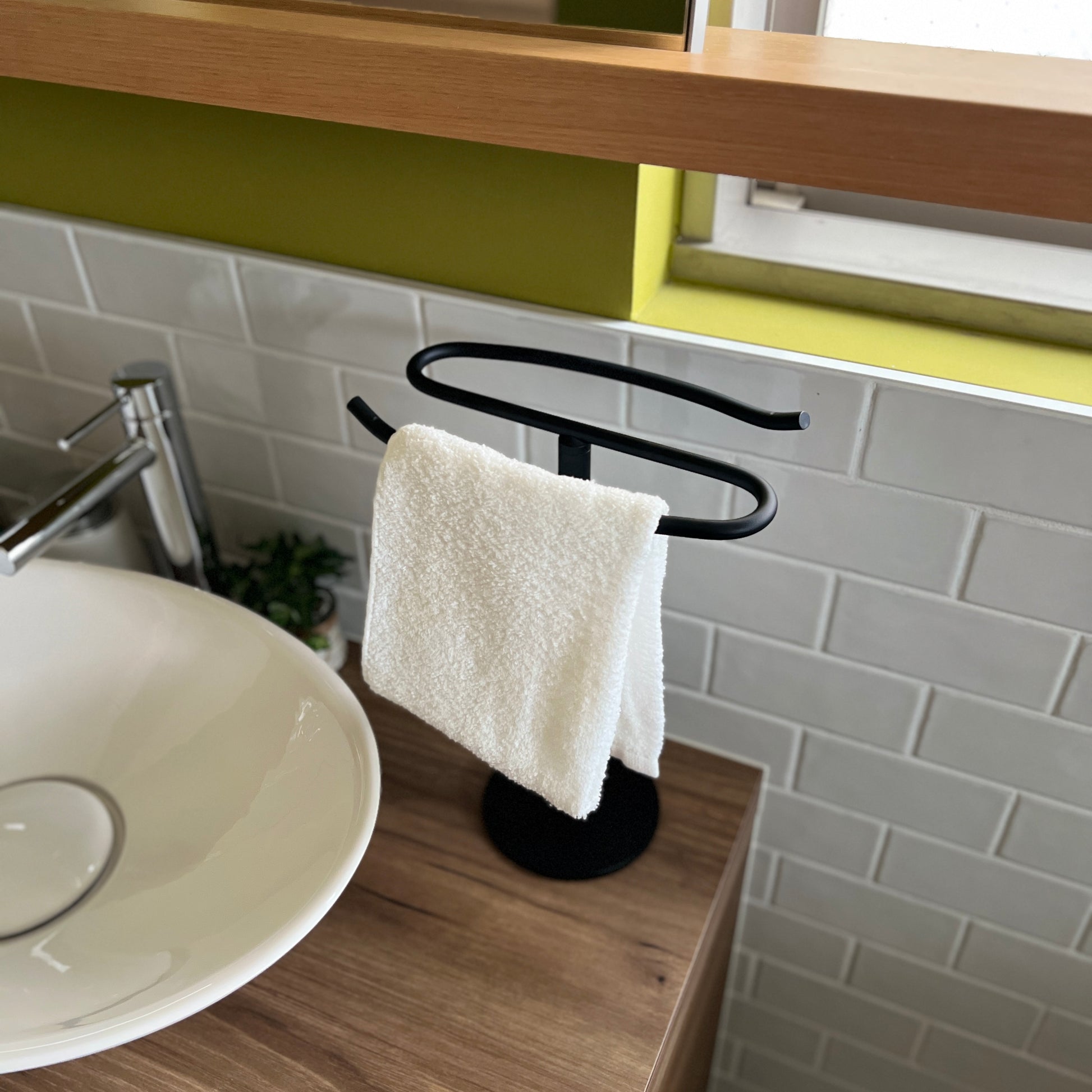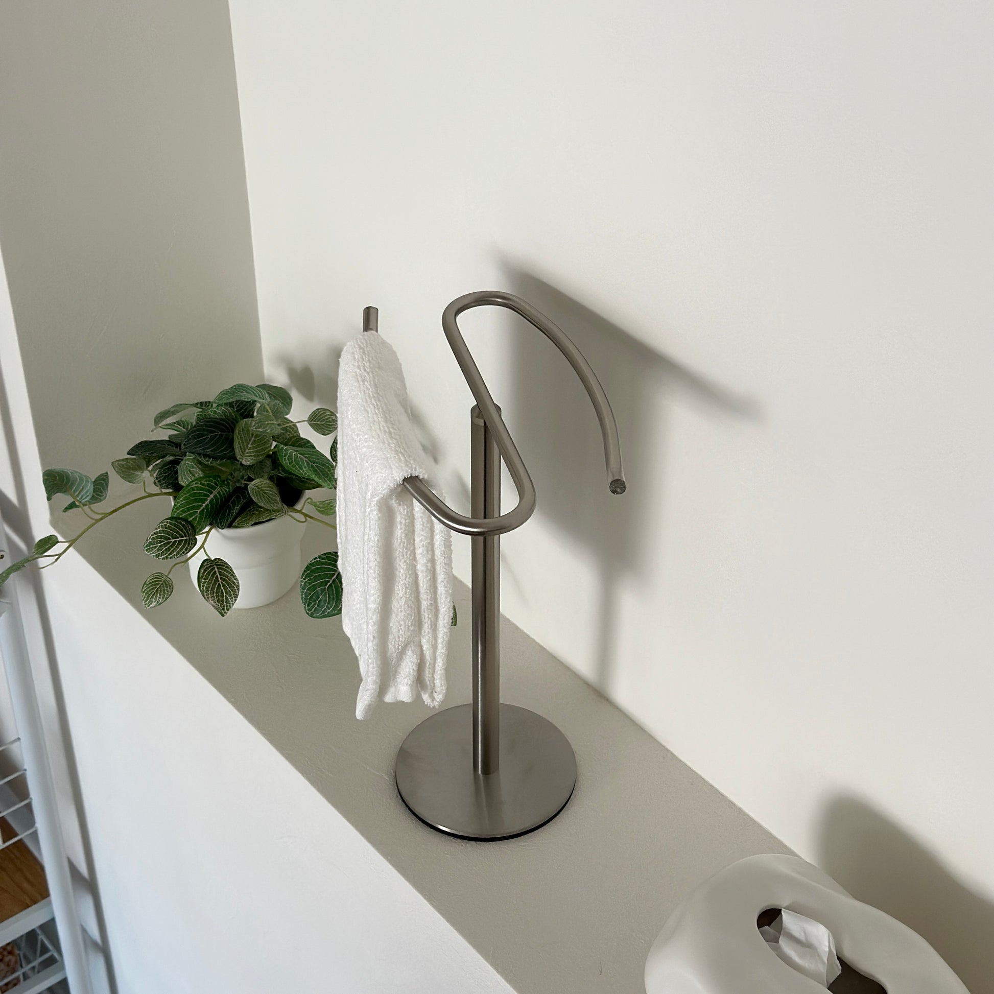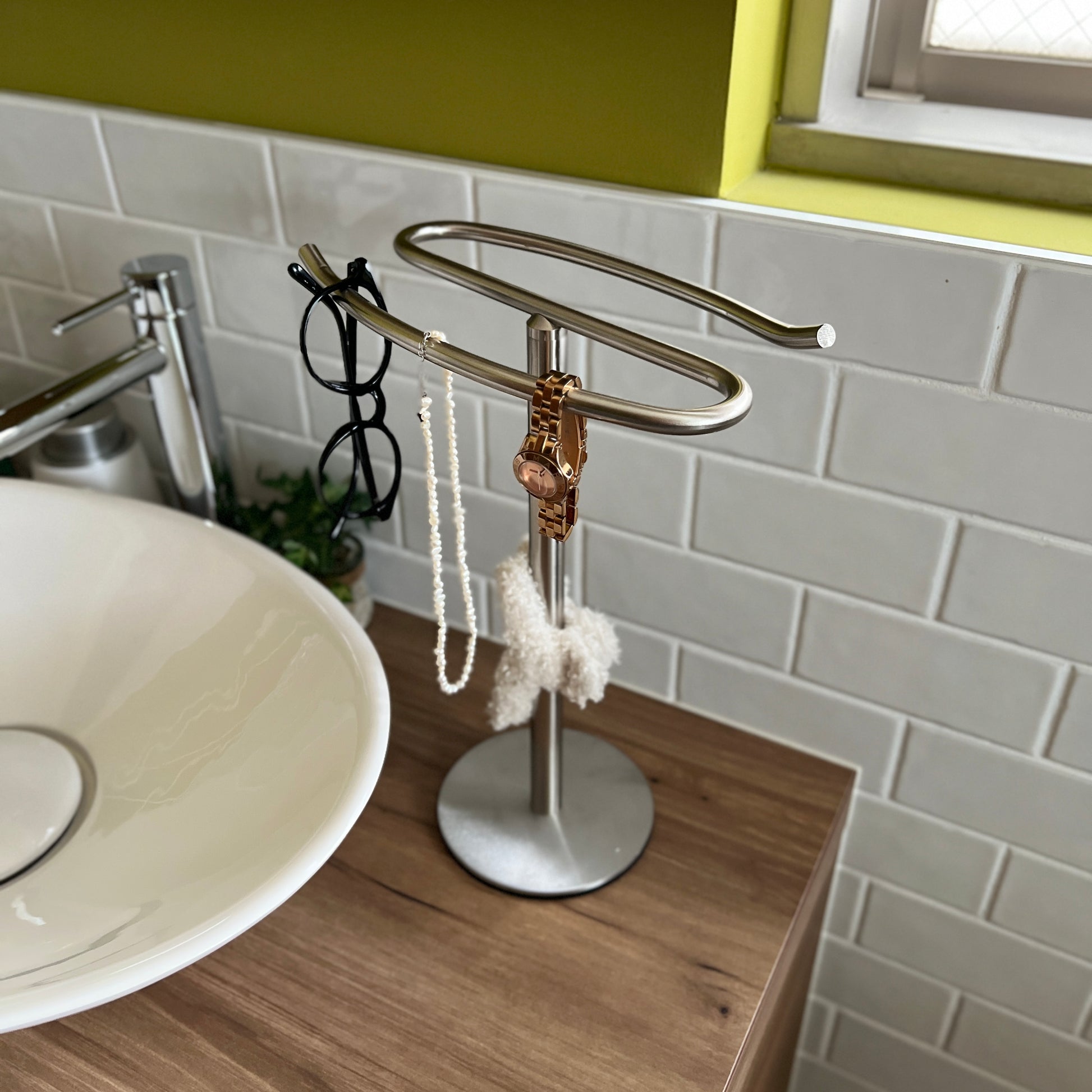 自立型のデザインなので、置き場所を選ばず設置が可能。洗面所ではタオル掛けに、キッチンでは布巾や調理器具の収納に、リビングではアクセサリーや腕時計の一時置きにも便利です。