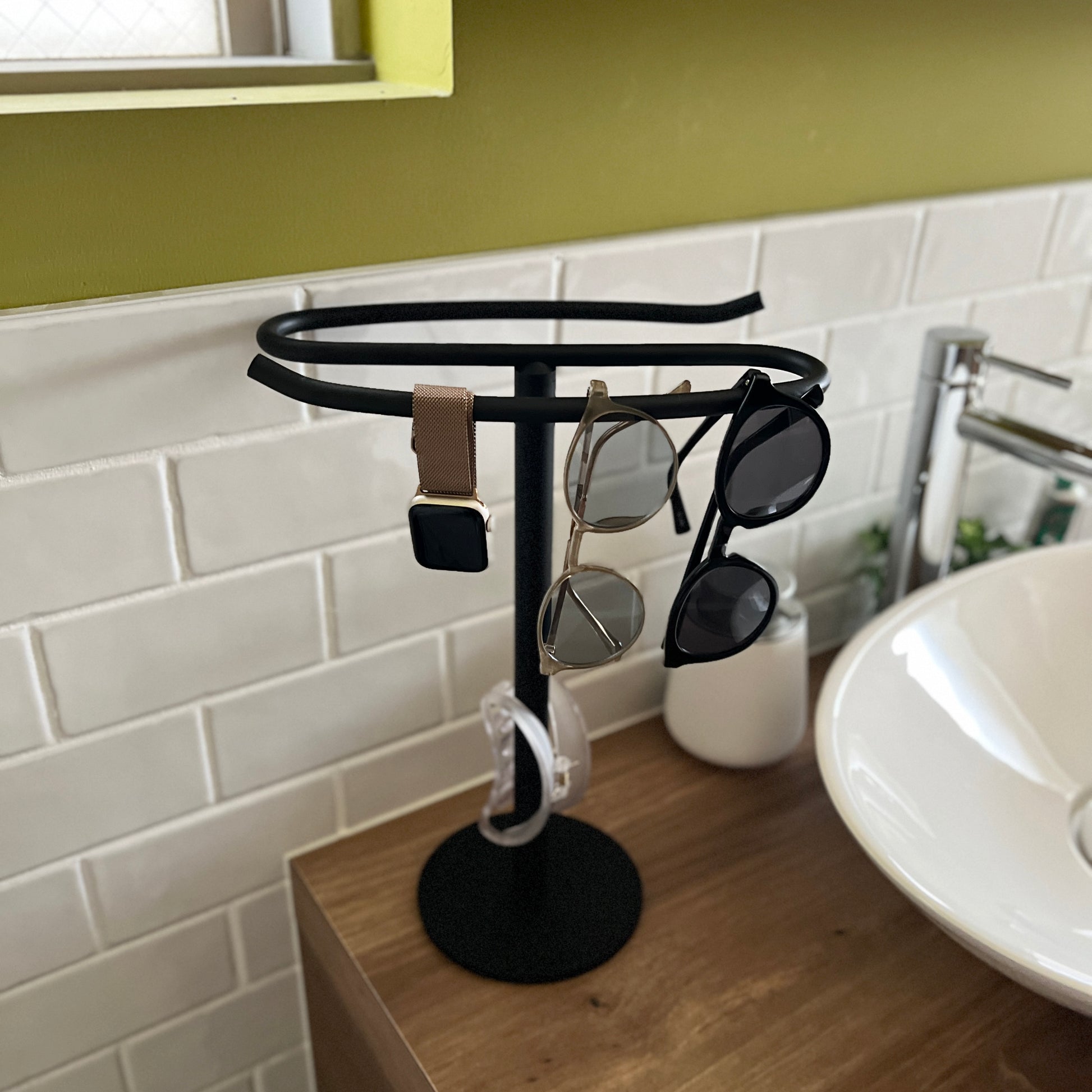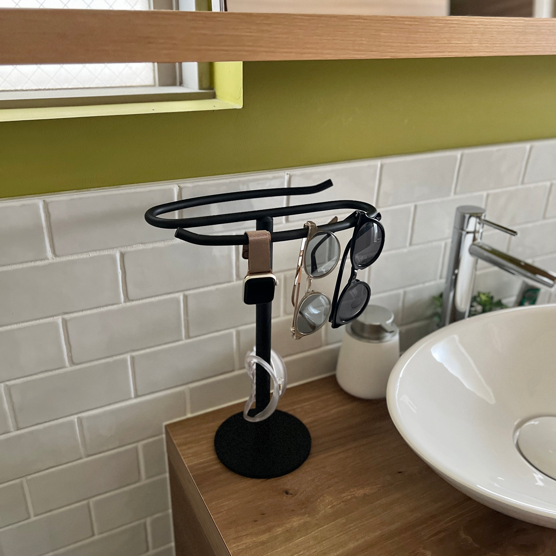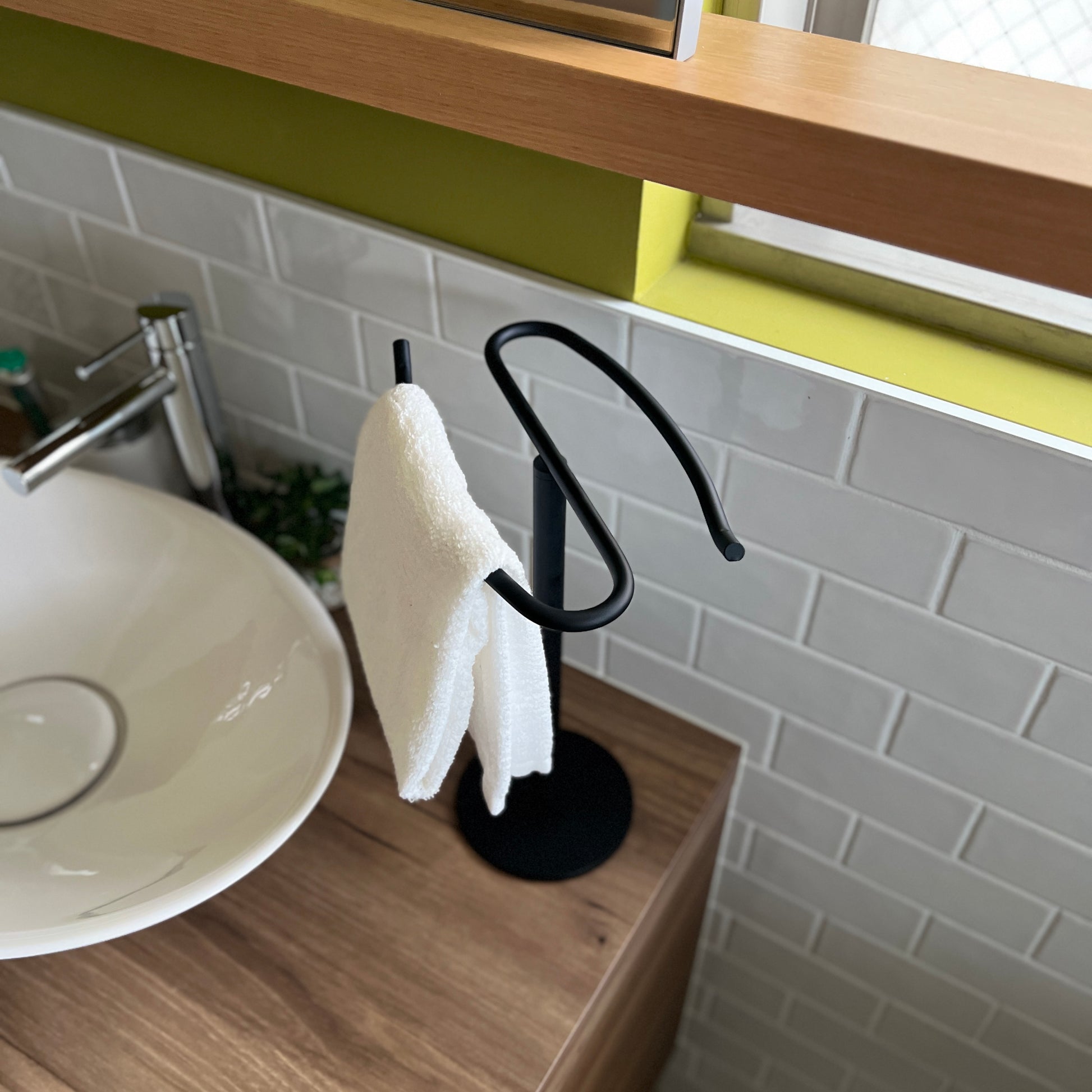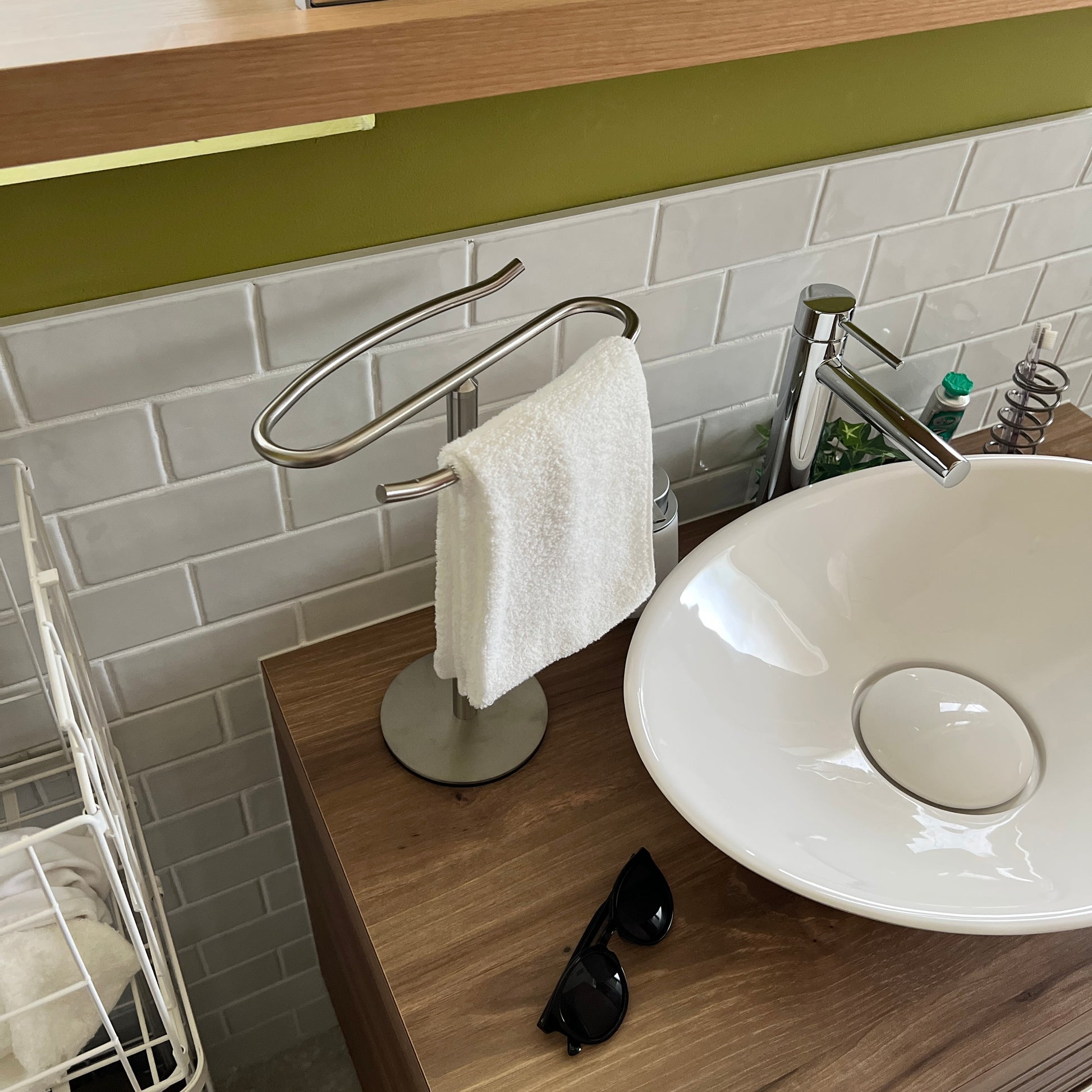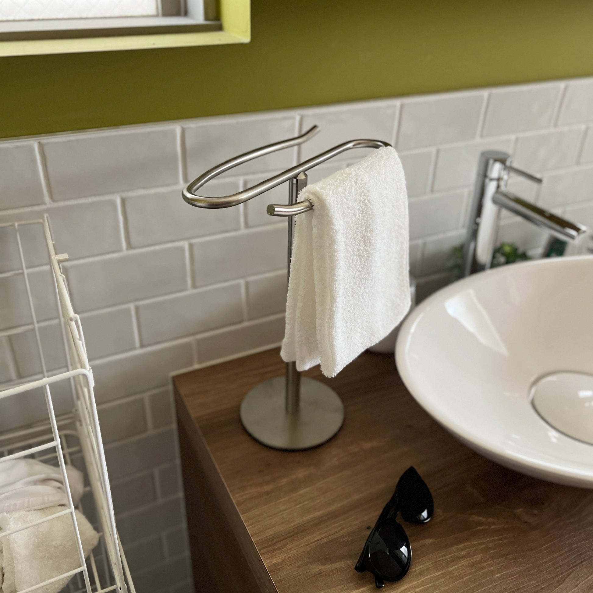 自立型のデザインなので、置き場所を選ばず設置が可能。洗面所ではタオル掛けに、キッチンでは布巾や調理器具の収納に、リビングではアクセサリーや腕時計の一時置きにも便利です。