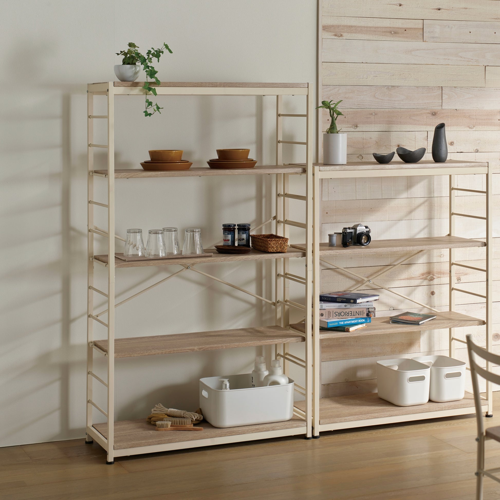 5段の棚は、収納とディスプレイの両方に対応します。お気に入りの小物や書籍、植物などを飾り、自分らしい空間を演出できます。