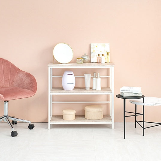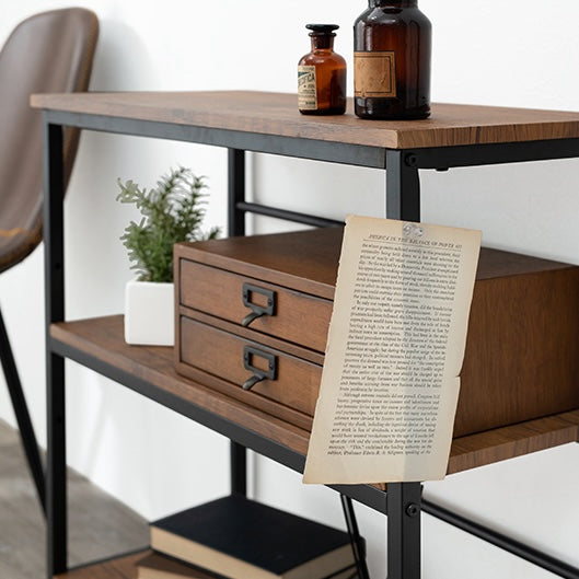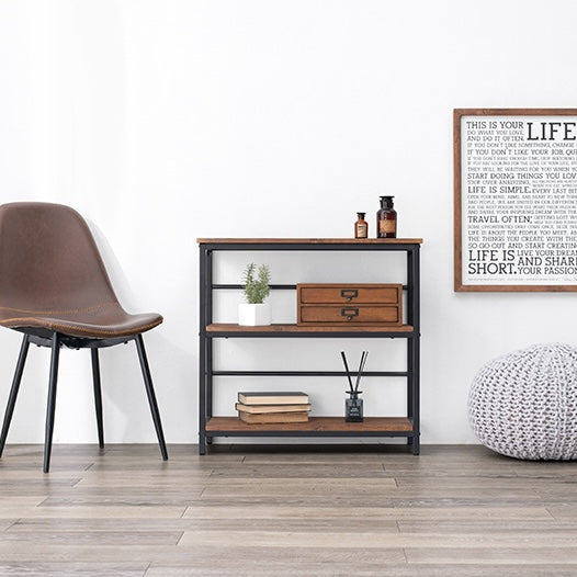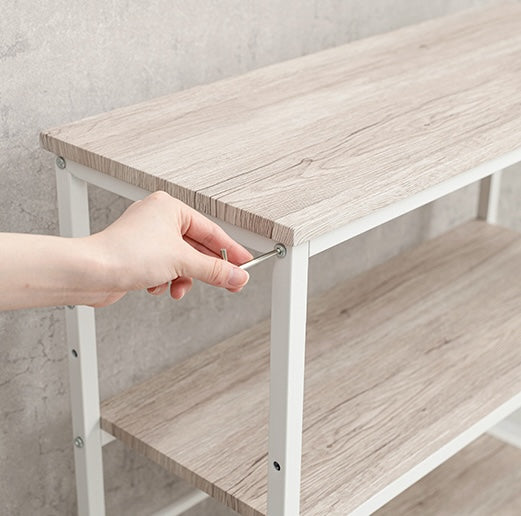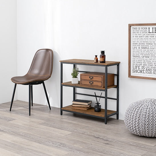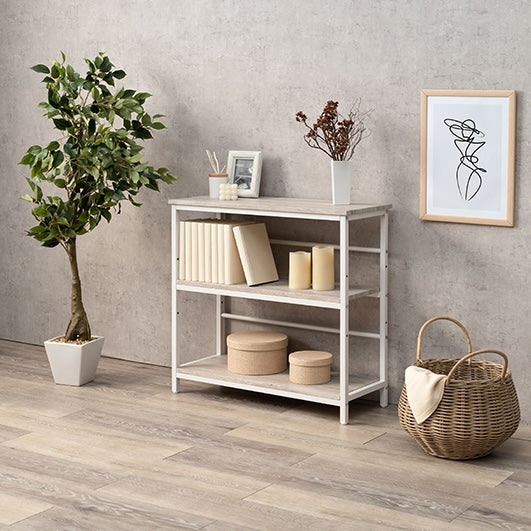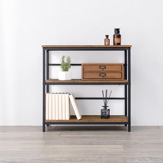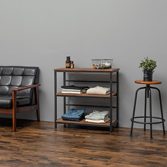アイアンフレームと木目調の棚板を組み合わせた、シンプルなオープンラックです。3段構造で、リビング・ダイニング・書斎・寝室など、置く場所を選ばず使いやすいサイズ感。抜け感のあるデザインなので、圧迫感を抑えながら収納を増やせます。