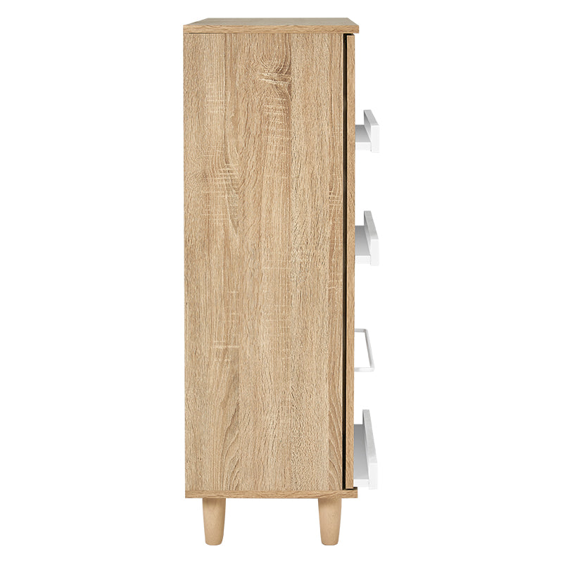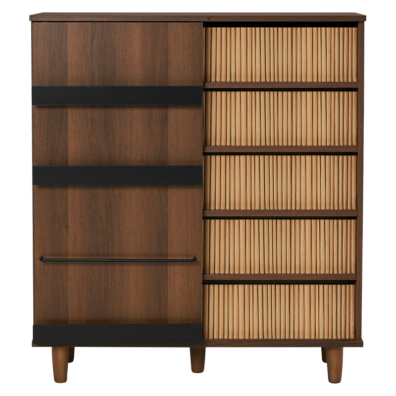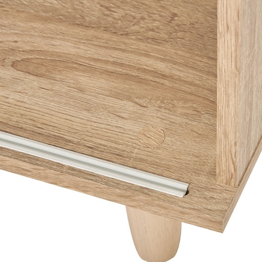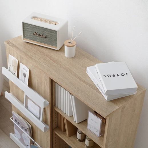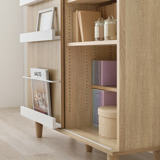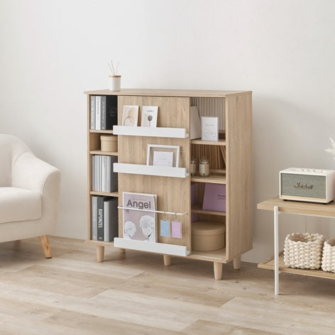 前後に分かれた棚板構造で、収納物を整理しやすくなっています。スライド扉の前板には雑誌や小物を立ててディスプレイできます。カラーはナチュラルとブラウンの2色展開で、部屋の雰囲気に合わせて選べます。
