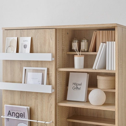 リビングでは本や雑誌をまとめて収納でき、扉を閉めれば生活感を抑えられます。書斎では資料やファイル類の整理に使えます。ワンルームでは、よく使う物は見せて、隠したい物は扉側に収納するなど、使い分けが可能です。