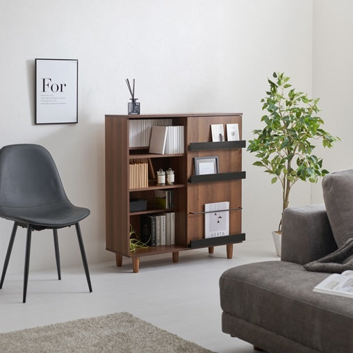 見せる収納と隠す収納を使い分けられる収納棚です。片側だけがスライド扉になっており、リビングや書斎、ワンルーム、寝室など、置き場所を選ばず使えます。奥行きを活かした設計で、本棚としても使いやすいサイズ感です。