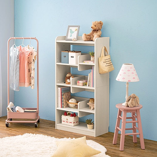 リビングでは本と雑貨を並べて収納できます。子供部屋では絵本を表紙が見える状態で置けるため、出し入れもしやすくなります。前後から物を取れるので、間仕切りとして使いながら、両側からアクセスする使い方も可能です。