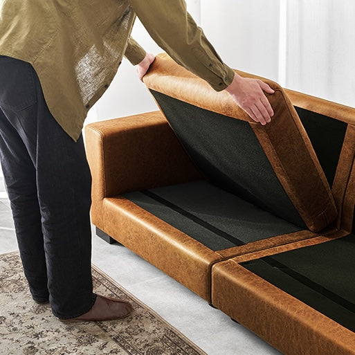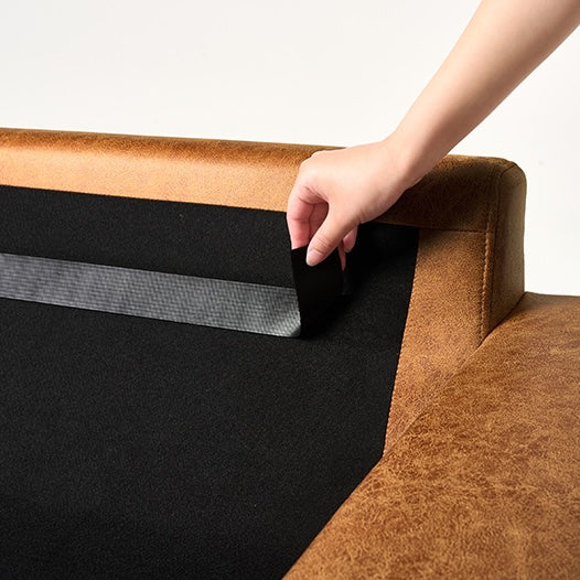 クッションは取り外しができ、掃除の際に手入れしやすくなっています。分割式構造で配置替えがしやすく、レイアウトの自由度があります。カラーはライトブラウンで、ミニクッションが付属しています。