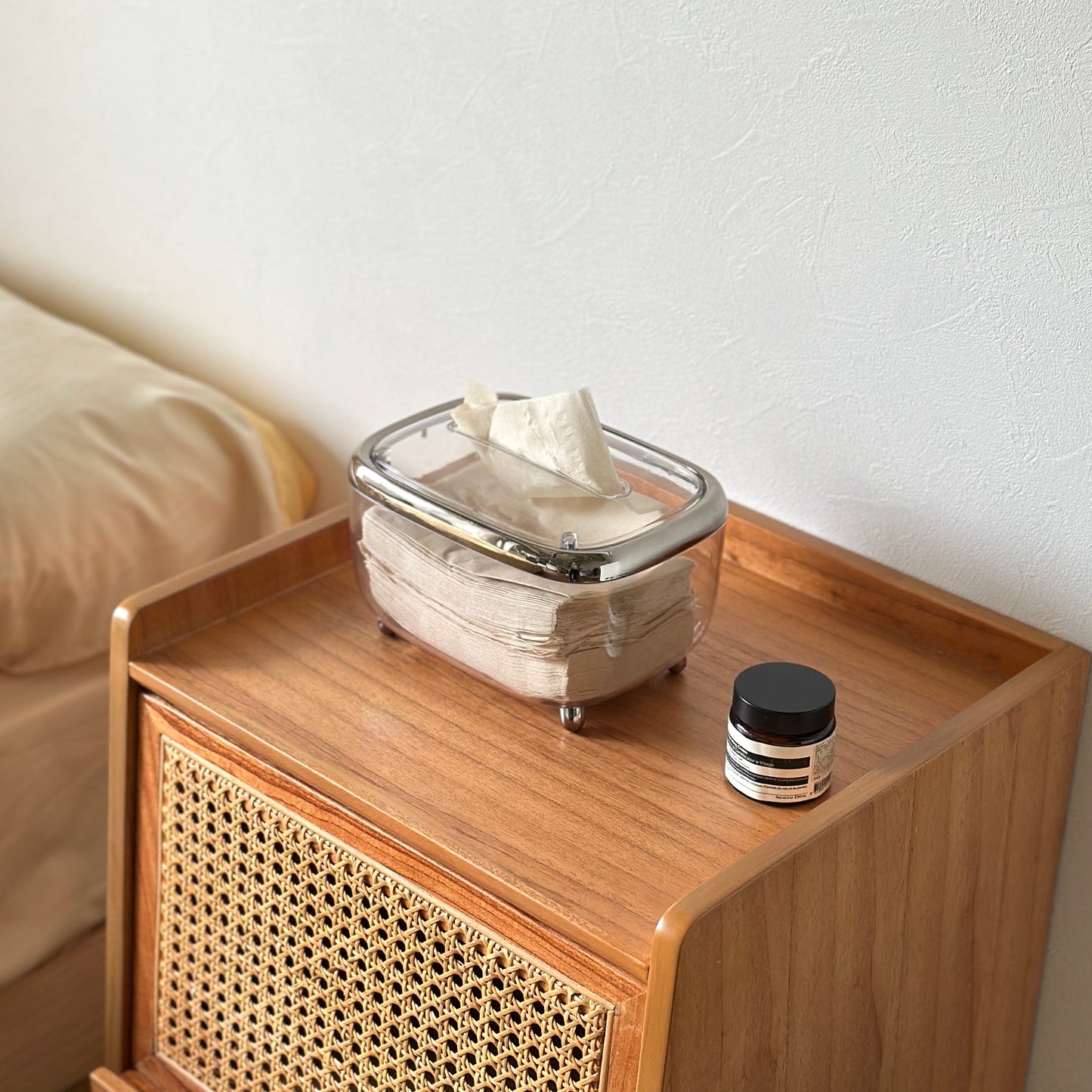 メタリックフレームと脚付きの構造が、空間に洗練された印象を与えます。ティッシュボックスをスマートに収納し、生活空間に馴染むようデザインされています。