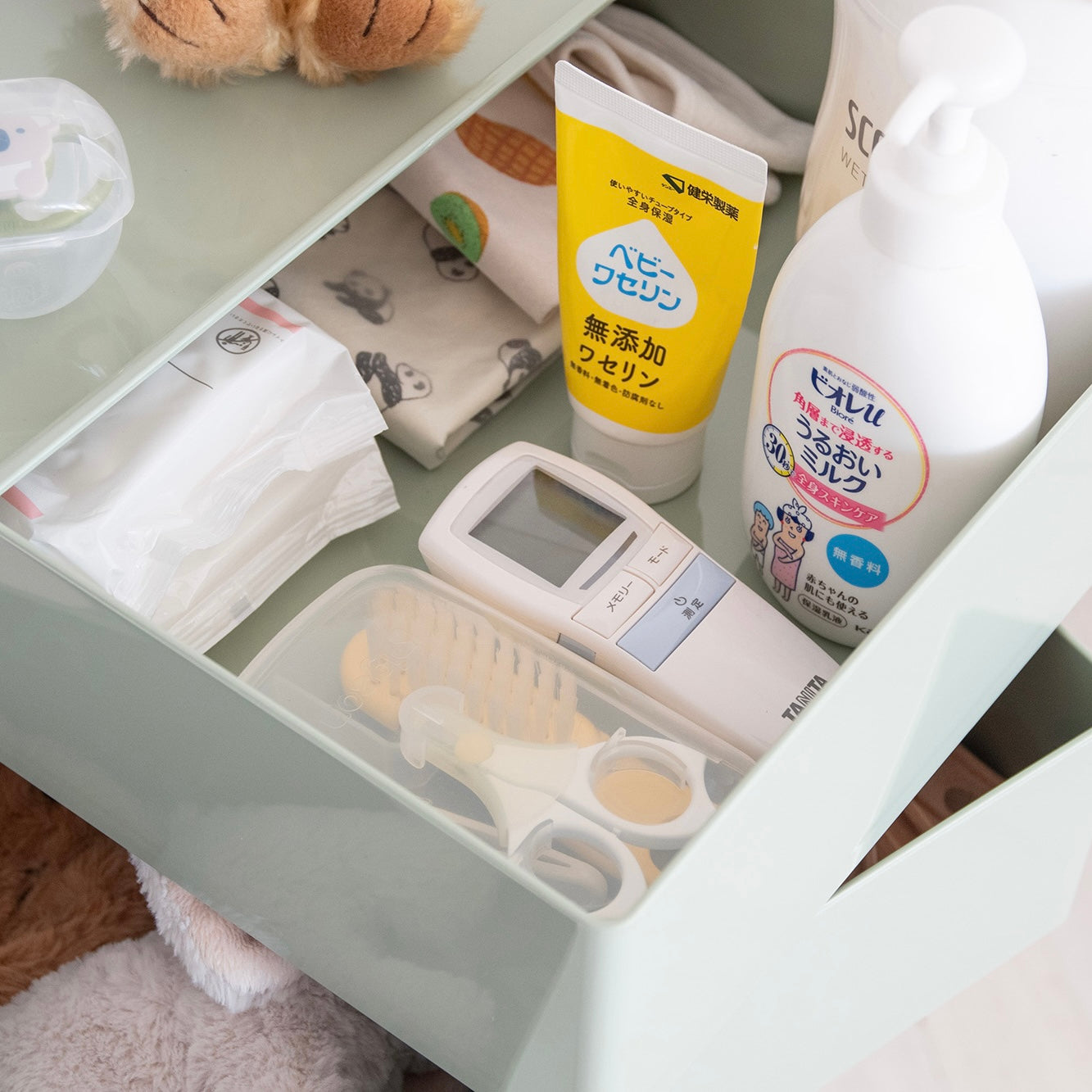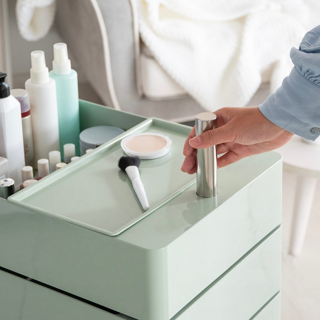 また、収納部はスライド開閉式なので、中の物を埃から守りながら、必要な時にスムーズに取り出すことが可能です。日用品の整理にも役立ち、散らかりがちな空間を整えます。