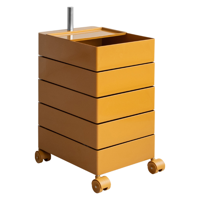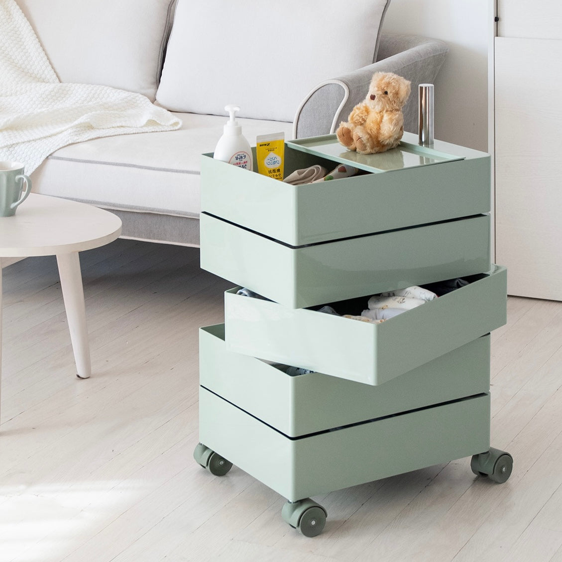 リビング、寝室、書斎など、お部屋の様々な場所で活躍する収納家具です。5段の収納ボックスを備えており、雑貨や小物などをまとめて大容量収納できます。飲み物や本を置くサイドテーブルとしてもご活用いただけ、生活空間にすっきりと溶け込みます。