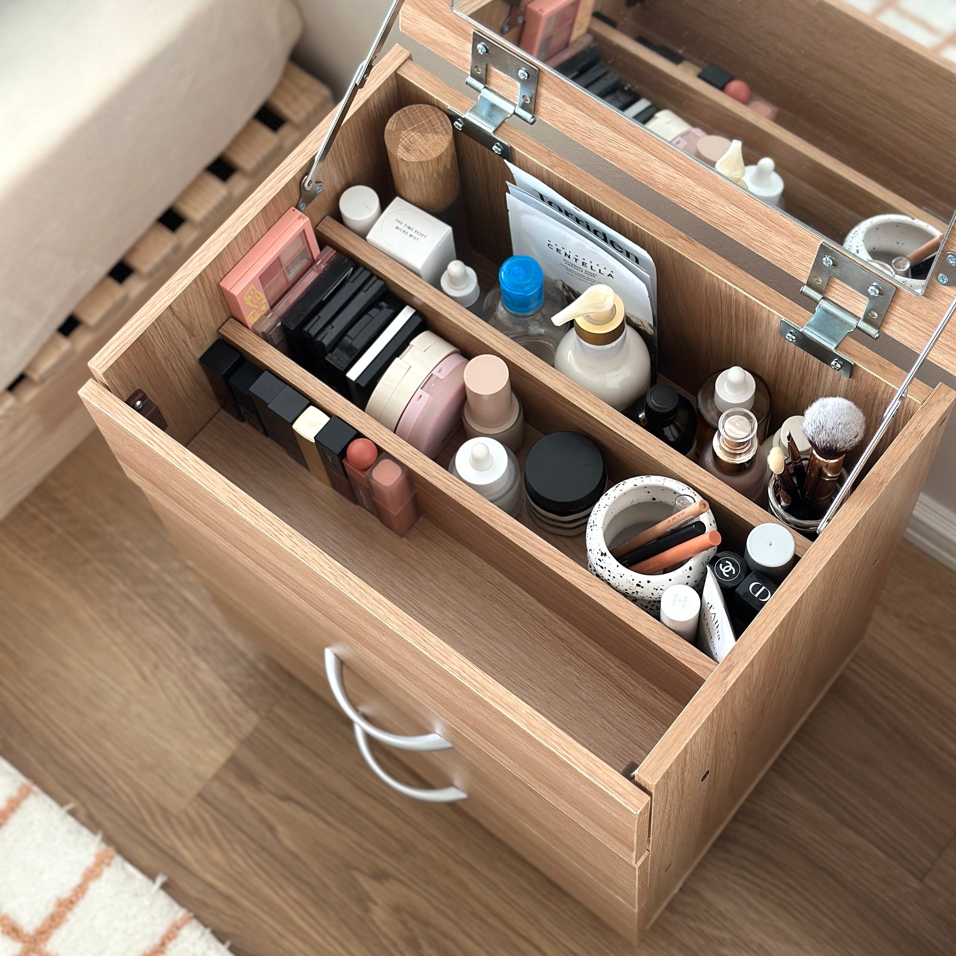 収納も豊富だからごちゃつきがちなスキンケアアイテムもメイク道具もこれ一台でスッキリ収納が叶います。2段の引き出しが付いてるから、ヘアアイロンやドライヤーもしまっておけます◎